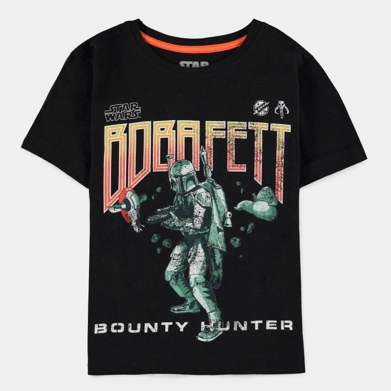 Believe that even a young Mandalorian can take charge against bigger enemies, especially when wearing this chic black t-shirt with a cool Boba Fett printed front graphic and stylish contrast orange taping in the neck!