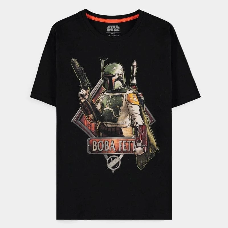 Prove that you have no fear of this legendary bounty hunter by wearing this sleek t-shirt with a fantastic Boba Fett printed graphic on the front and stylish contrast orange neck tape!