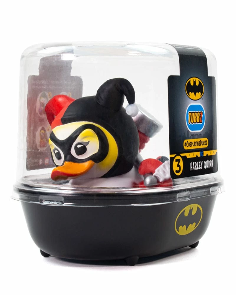Put on your cape and release your inner hero, with the DC Comics range of TUBBZ – the collectible cosplaying duck figurines! Harley Quinn joins her psychotic lover Joker to bring the fight against Batman and Robin to the ponds of Gotham. Coming boxed in an awesome displayable βBatmanβ tub display stand, this one of a kind collectible is great for fans of the series to stock up on!