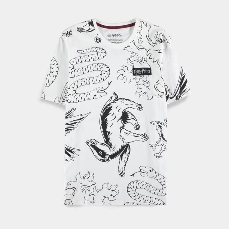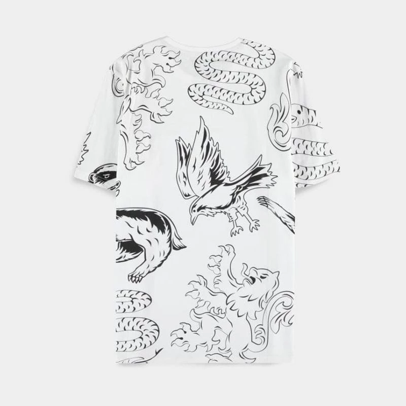 Infuse your wardrobe with the essence of witchcraft and wizardry with this chic official Harry Potter t-shirt, featuring a stylish all-over-print of the infamous Hogwarts house emblems.