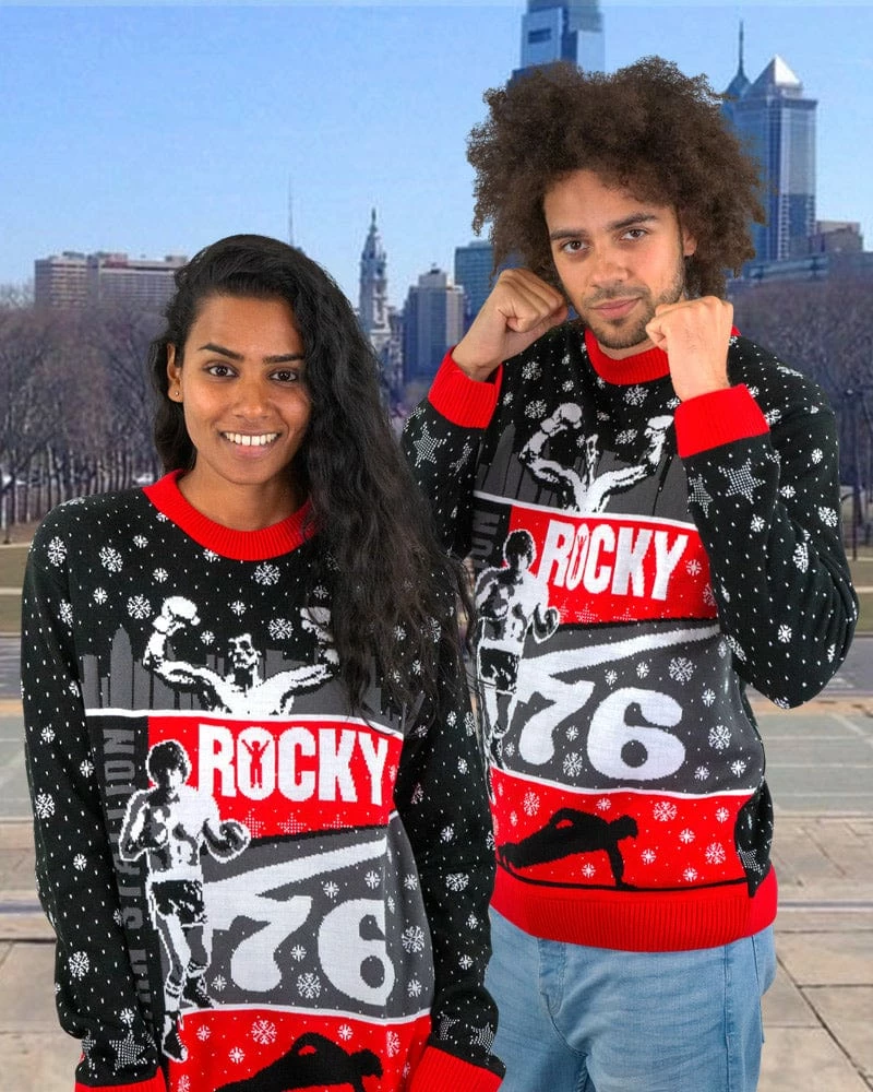 Endorsed by the Italian Stallion himself, this 100% knitted jumper is fit for any heavyweight boxing champion of the world! In traditional seasonal colours of red, blue, and muted grey, silhouettes of the everyman boxing legend proudly covers the front of the Nordic jumper, showcasing his difficult training regime against his rival Apollo.