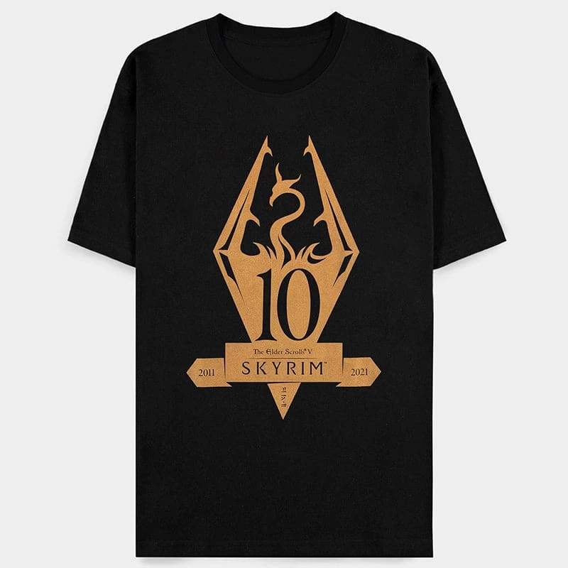 Stake your claim as Skyrimβs supreme champion with this incredible t-shirt which features a sleek metallic screen-printed anniversary graphic on the front, making it the perfect addition to any Dragonborn’s wardrobe!