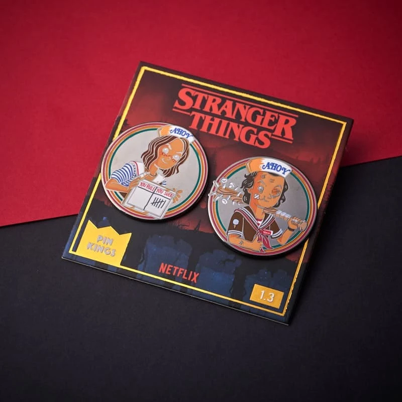 Aside from dishing out ice cream all day at Scoops Ahoy in Starcourt Mall, Steve and Robin find themselves working together to decipher the Russianβs schemes in Hawkinsβalthough according to Robinβs whiteboard she appears to have done most of the work! If youβve got a lot of love for Stranger Things, these premium enamel pins are the best way to show that off. These pins are ideal for wearing on your coat, bags or accessories.